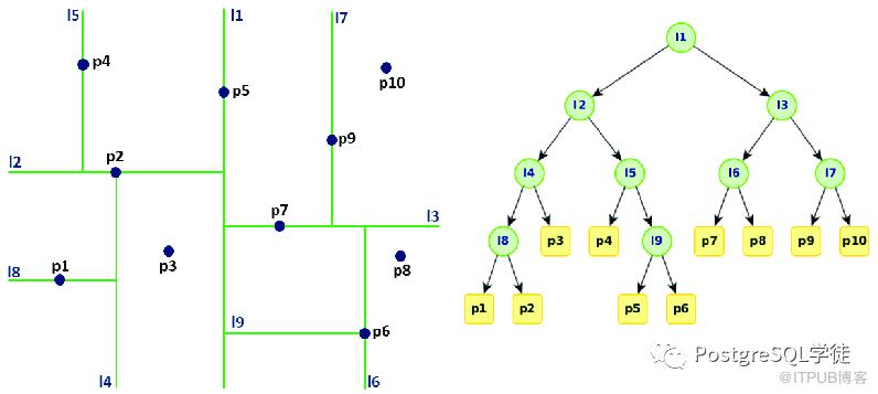 KD-tree 是 K-dimension tree 的缩写,是对数据点在 k 维空间如二维 (x,y),三维 (x,y,z),k维 (x,y,z..)中划分的一种数据结构,就是把整个空间划分为特定的几个部分,然后在特定空间的部分内进行相关搜索操作。每次切分点为树的节点,最终构造的树结构如下,右侧的X和Y分别表示基于第一个维度和第二个维度进行切分。