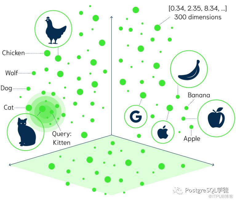通过向量,那些概念上更为接近的点在空间中更为聚集 (不妨通俗地理解成我们常说的——物理类聚,人以群分),而那些概念相差甚远的点,在坐标系里的距离也就相距很远。比如鸡 (chicken) 和猫 (cat) 都属于动物,所以在坐标系里的距离相近,而与香蕉 (banana) 相距甚远。