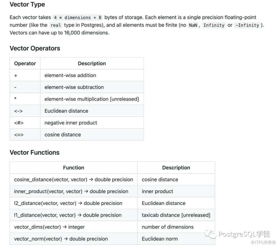 可以看到 pgvector 支持余弦、欧式和内积操作符。内积 (inner product) 一般用在内积空间中,点积 (dot product) 一般用在欧几里得空间中,数量积 (scalar product) 通常认为与点积是相等的。