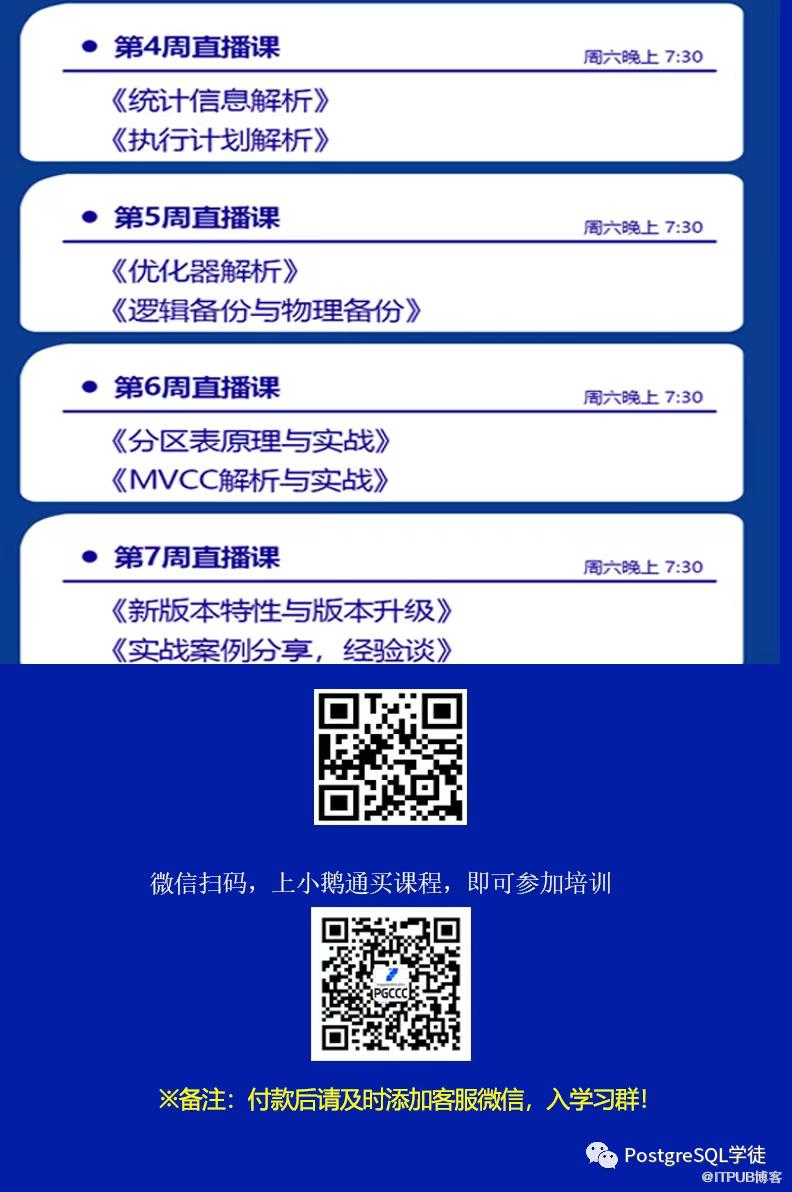 最后宣传一下,筹划许久的《PostgreSQL实战精英课》已经正式上限了,此门课程聚焦于实战,注重实战技能的提升,囊括多个经典案例的解析,让你在运维 PostgreSQL 的时候不再无所适从,不知如何下手,PostgreSQL 的势头如此火热,人才需求越来越大,感兴趣的小伙伴不要错过啦,可以联系我 ( _xiongcc )或者添加客服微信 ( pgccc400 )。