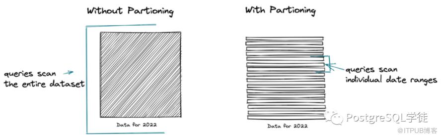 拆分成多个子表,那么就可以实现逻辑意义上的并行 vacuum,多个 vacuum 进程可以同时作用于多个子表,包括年龄冻结、死元组回收、创建索引等维护性动作 通过分区,可以实现类似冷热分离的效果,对于不常访问的子表,将其放在一般的媒介上面,对于频繁访问的对象,可以放在高端存储上 批量的加载和删除可以用删除或者 detach 子表实现,还可以避免大量删除导致的 vacuum 通过分区裁剪,可以定位到具体某一个子表,扫描的数据是分区前数据的一部分,可以有效提升性能,同时也意味着可以有更高的缓冲命中率