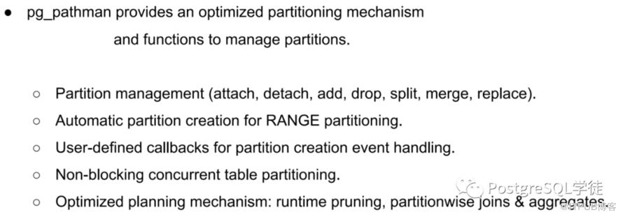 活久见——不同用户不同执行计划(分区表在预估行数的时候,代码逻辑可能会去判断子表的查询权限) 不同用户的执行计划居然会不一样?(分区表在预估行数的时候,代码逻辑可能会去判断子表的查询权限) 恼人的原生分区( 在 11 版本里面,分区裁剪的行为实际上第一次生成执行计划的时候会扫描所有子分区) 令人费解的分区表与表空间(在 11 的版本里面分区表父表指定的表空间完全没用,需要自己指定子表,普通表生效。而14的版本里面,分区表又生效了。) 修改列类型又掉坑了!(修改索引列,对于分区表有所出入,字段长度由小改大,虽然所有子表不会重写,但是所有索引会重写!由大改小规则不变,整个分区表和索引都会发生重写) 聊一聊分区表的几个参数(partition wise-join 和 partition wise-aggregation) 一起 pg_pathman 的有趣案例(在 explain 生成执行计划的时候就在不断地读取索引)