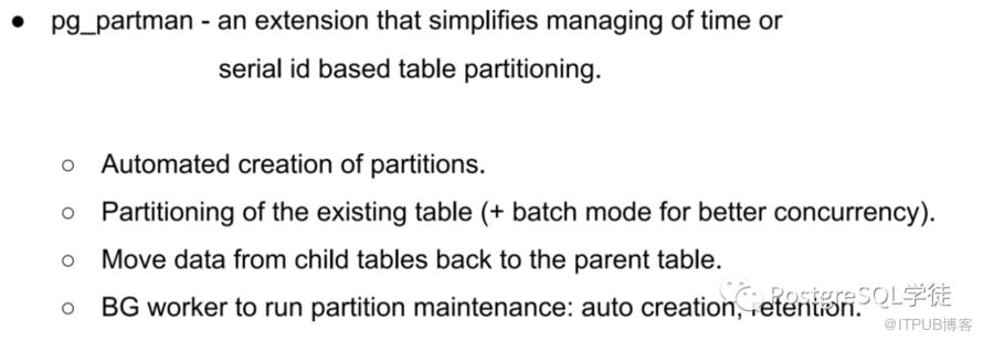 没有自动分区,意味着插入了不满足现有规则的数据会报错,需要通过 UDF 来实现,影响性能,当然 pg_pathman (HASH, RANGE partitioning)和 pg_partman(Time or serial id partitioning)支持,二者各有侧重,但是毕竟作为第三方插件,BUG 以及质量都难以保证,难以维护,笔者记录处理的 pg_pathman 的 BUG 就不下 10 个。