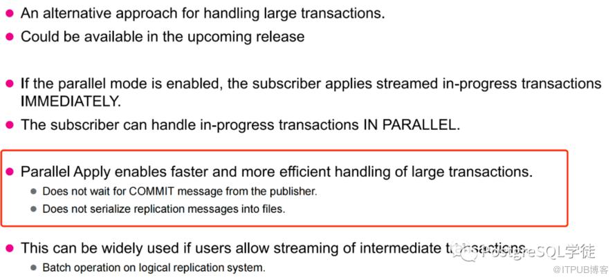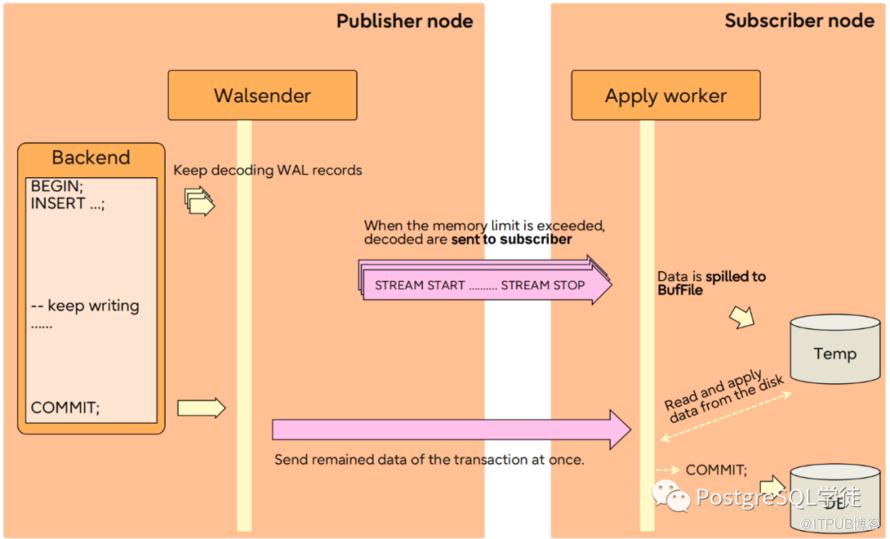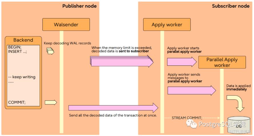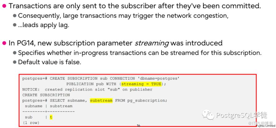 然后在 14 正式引入了"流式"传输,即未提交的事务也会流式传输到订阅端
