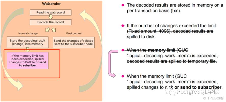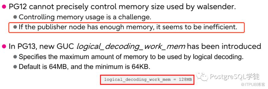 在 13 版本以后,引入了一个新的 GUC 参数:logical_decoding_work_mem