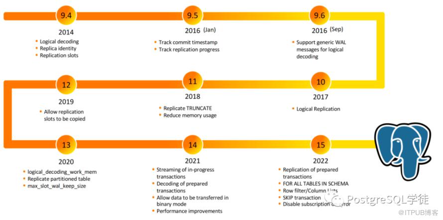 可以看到,社区一直在不断优化着逻辑复制的功能,相信在今年发布的 16 中,逻辑复制的能力会有一个质的飞跃。另外分享一个逻辑复制演进合订本 ?? 请叫我雷锋