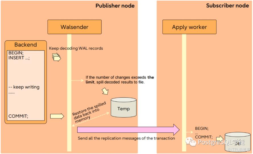 当发布端的事务提交,会从磁盘上将 spill 文件读出来,解析后再发送给订阅端,不难想象,这会涉及到一定的 IO。不过这块我倒是没有看到类似的等待事件,要是有类似的等待事件的话,也可以作为分析逻辑复制的一个手段。并且此处还提及了 12 版本不能很好控制 walsender 的内存使用,因此假如各位发现内存使用率很高的话,这个也是一个排查点。