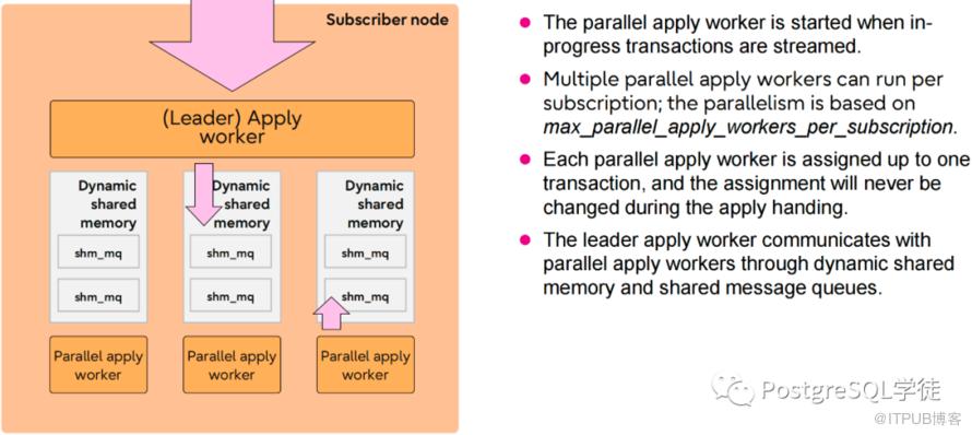 但是 13、14、15 三个大版本还是没有解决延迟的问题,只有在事务提交的时候,订阅端才可以进行回放,依旧会导致延迟。天空中最乌黑的那朵乌云依旧飘着,所以在 16 的版本里,又引入了并行回放——顾名思义,多个进程同时回放(要是 startup 也能多进程就好了)