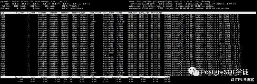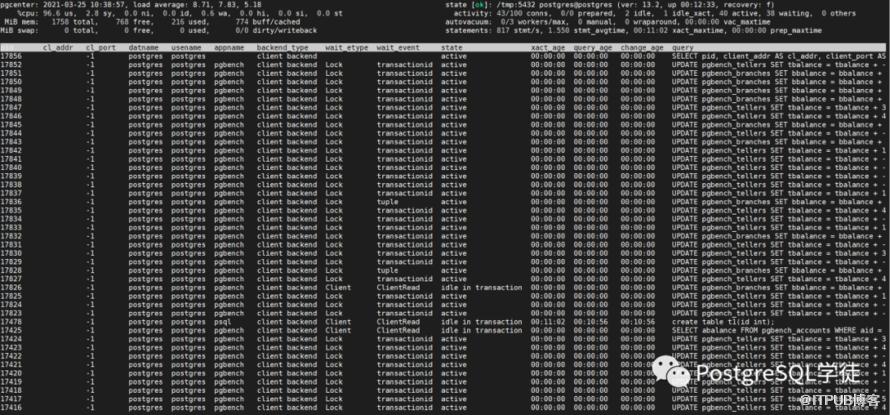 使用pgbench进行压测,然后使用pgcenter进行观察。