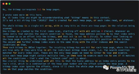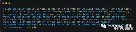 看完之后,也分享几点在看的过程中的疑惑之处,首先是P298的关于bitmap scan的讲解,原文是:Recheck Cond(id2 > 10000),因为多版本的原因,从索引中找出的行从表中读出后还需要再检查一下条件。以前针对bitmap scan,其实原理就是将随机IO转化为顺序IO,如果获取的结果集的占比比较小,但是元组数很多时,Bitmap Index Scan 的性能要比Index Scan 好。这一块是Tom lane的一点解释,核心是传统的index scan每次从索引中去取一个tuple的指针,然后立马去表中取数据,每一次会造成一次随机io。如果数据量较多的情况下,会比较低效。而bitmap scan一次性将符合条件的tuple-pointers全部取出来,然后在内存中进行地址排序,然后去取出数据,这时的读取数据由于进行的地址排序,读取时就变成了顺序的读。其实就是一个随机读转化为顺序读取的过程,但是取出的数据由于进行了地址的排序,就没有顺序。同时,对于limit这种sql,bitmap index scan这种就不适合,因为它一次会取出所有数据。