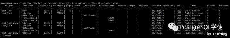 pg_stat_activity视图可以看一个大概,具体锁信息还需要结合pg_locks查看,SQL如下:select relation::regclass as relname,locktype,'('||page||','||tuple||')' as ctid,transactionid,virtualtransaction,virtualxid,pid,mode,granted from pg_locks where pid in (1289,1290) order by pid;