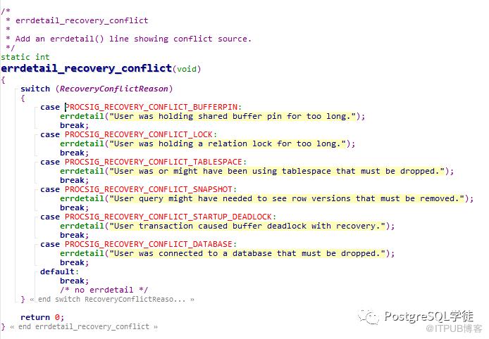 2.其中Buffer pin的conflict在源码中确实有注明:User was holding shared buffer pin for too long,Buffer pin在缓冲区管理里面有介绍,refcount holds the number of PostgreSQL processes currently accessing the associated stored page. It is also referred to as pin count. When a PostgreSQL process accesses the stored page, its refcount must be incremented by 1 (refcount++). After accessing the page, its refcount must be decreased by 1 (refcount--).,意思就是访问当前页面的PostgreSQL进程数,有一个就+1,会在页面淘汰算法中用到,德哥的一个帖子中有介绍https://github.com/digoal/blog/blob/master/201608/20160815_03.md