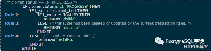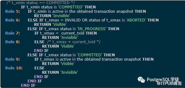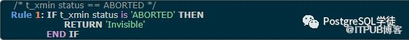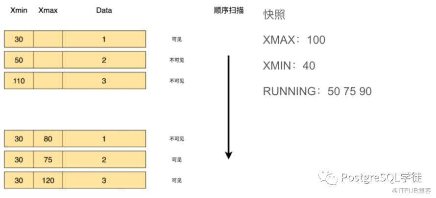 (这里假设图片中表示的事务都已经提交)图片上面的三条数据中,xmin都是有值的,xmax都是没值的,这意味着这三个数据被插入进来后,还未被删除。和快照中的xmin,xmax和Running进行对比,30小于快照中的xmin,已经提交了,因此这条数据是可见的。50在Running列表中,还在执行中,因此不可见(注意第二张图,IF t_xmin = current_txid, return visible,大多数情况下都不可见,除非是事务自身,也就是说50这个事务获取了这个快照,50事务进行了插入但没提交,当然对于自己来说也可见),110大于xmax,对于当前快照来说仍还未提交,也不可见。