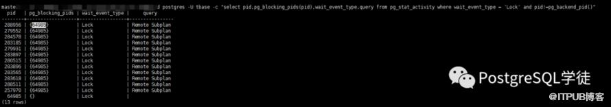 4)第四点也是最容易被忽视的一点,之前在定位锁冲突的过程中,发现startup回放进程会获取一个AccessExclusive Lock,这一点很是诧异,于是通过如下SQL抓取阻塞进程select pid,pg_blocking_pids(pid),wait_event_type,query from pg_stat_activity where wait_event_type = 'Lock' and pid!=pg_backend_pid();