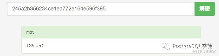 -bash-4.2$ psql psql (12.4) Type "help" for help. postgres=# \c postgres user2 You are now connected to database "postgres" as user "user2". postgres=> postgres=> select * from pg_shadow ; ERROR: permission denied for view pg_shadow 密码的加密方式如下:md5(xxxusername) postgres=# select 'md5'||md5('123user2') as mypasswd,passwd,usename from pg_shadow where usename = 'user2'; mypasswd | passwd | usename -------------------------------------+-------------------------------------+--------- md5245a2b356234ce1ea772e164e596f395 | md5245a2b356234ce1ea772e164e596f395 | user2 (1 row) |