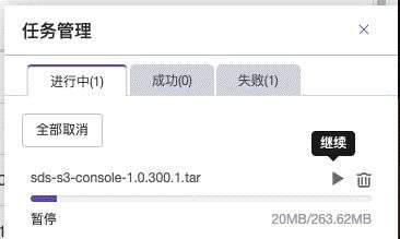 为了避免已经上传的分段数据重复上传,提高数据上传效率。在任务管理列表中增加了暂停和继续的断点续传功能,进行中的上传任务可以中途“暂停”,下次点“继续”时则会从上次完成的分段数据之后开始继续上传,避免已经上传的分段数据重复上传。使用“暂停”可中断低优先级的任务,让重要的任务优先进行。
