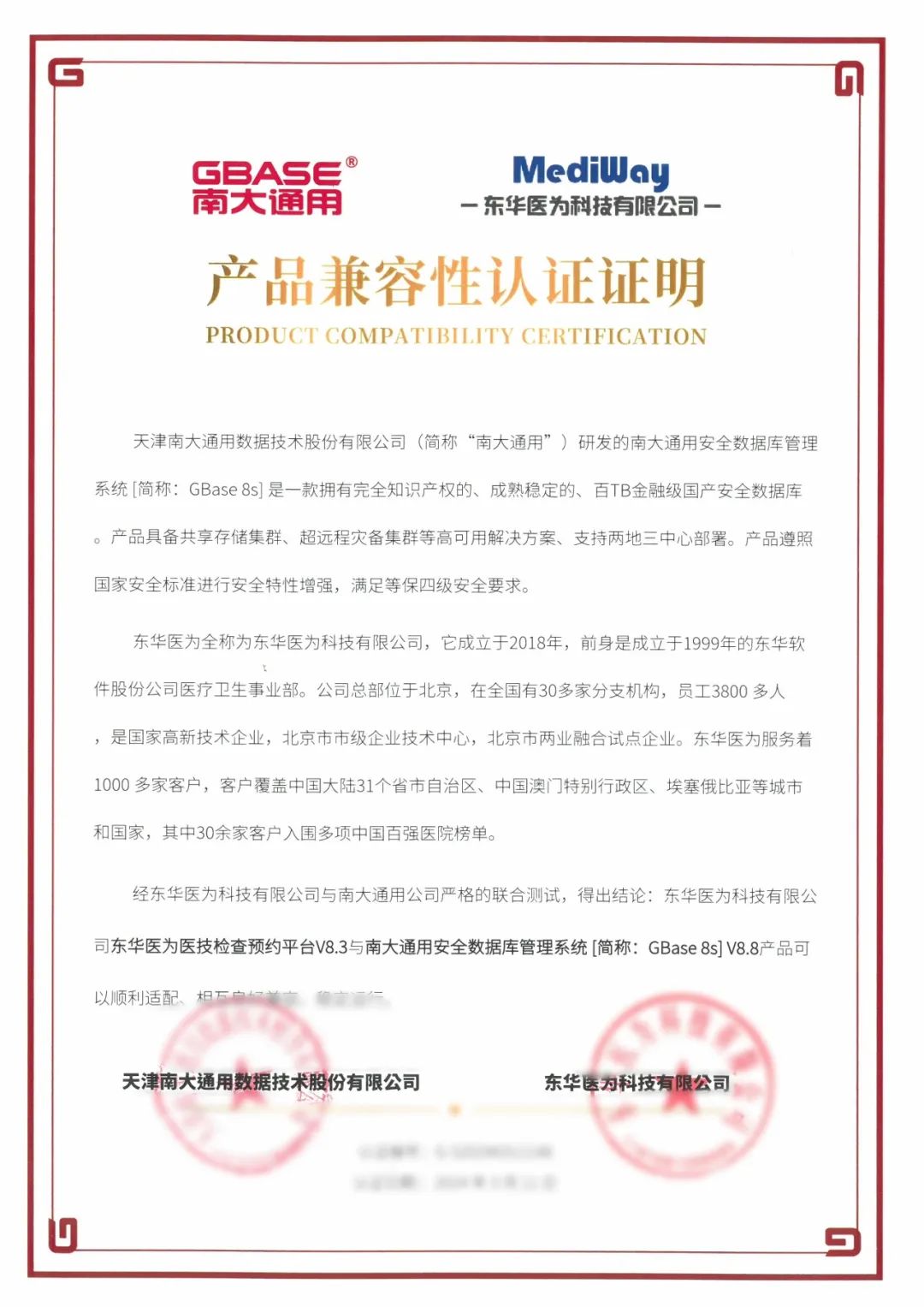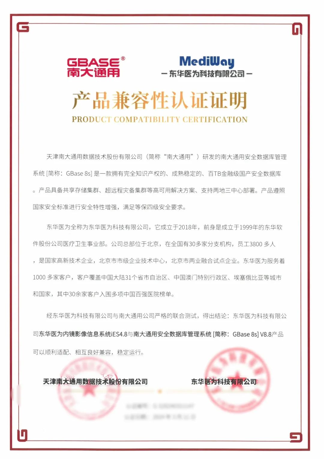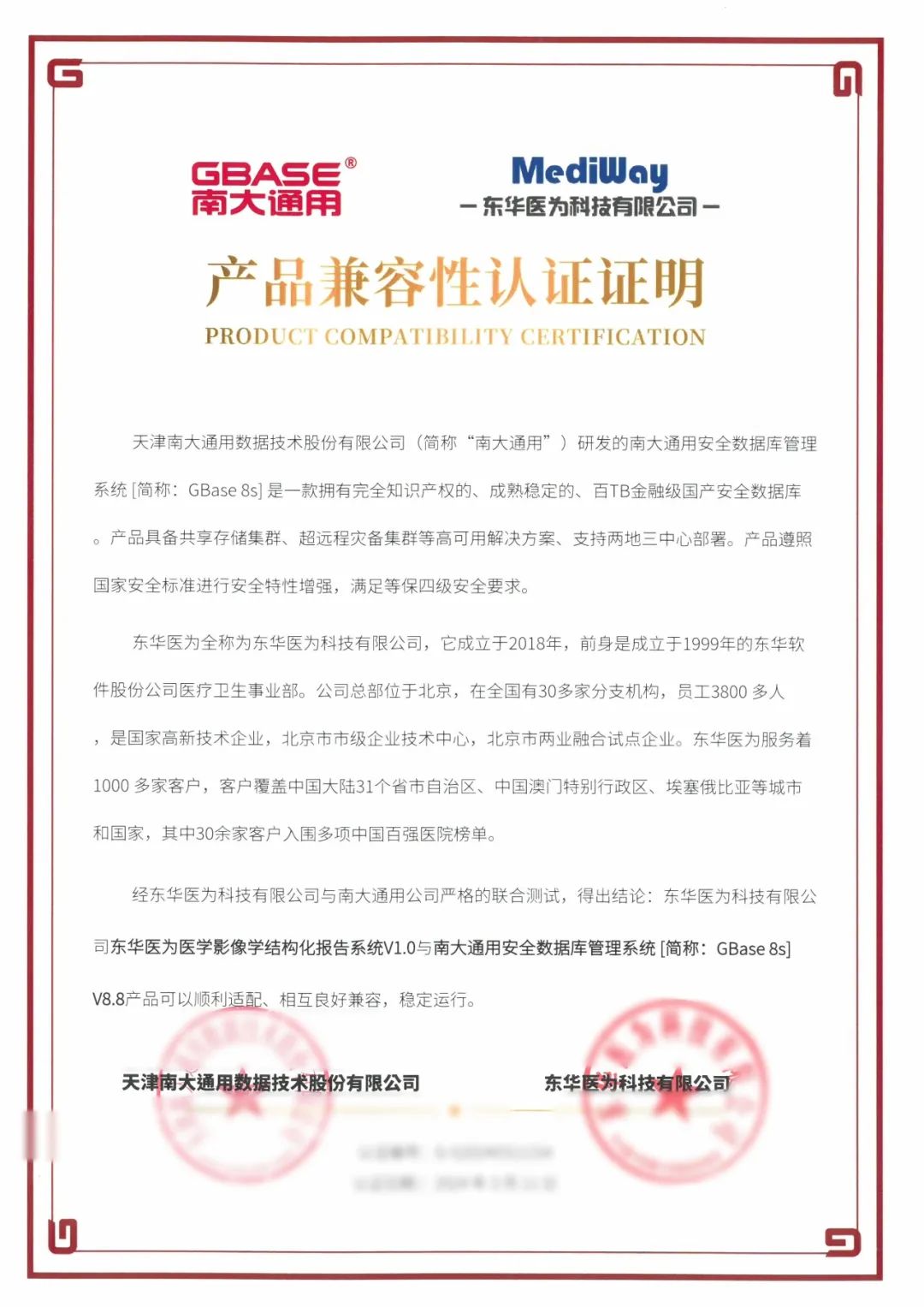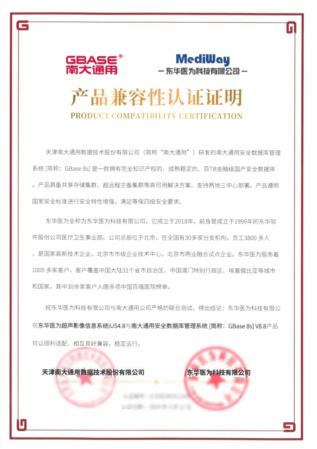 日前,GBASE南大通用与东华医为科技有限公司(以下简称东华医为)完成产品兼容联合认证。南大通用集中式事务型数据库GBase 8s V8.8、分布式事务型数据库GBase 8c V6与全民健康平台、检查检验结果互认平台、医共体平台、超声影像信息系统iUS4.8、放射影像信息系统iPACS4.8、内镜影像信息系统iES4.8等二十余款软件产品完成兼容性、功能、性能等方面的深度适配与调优。