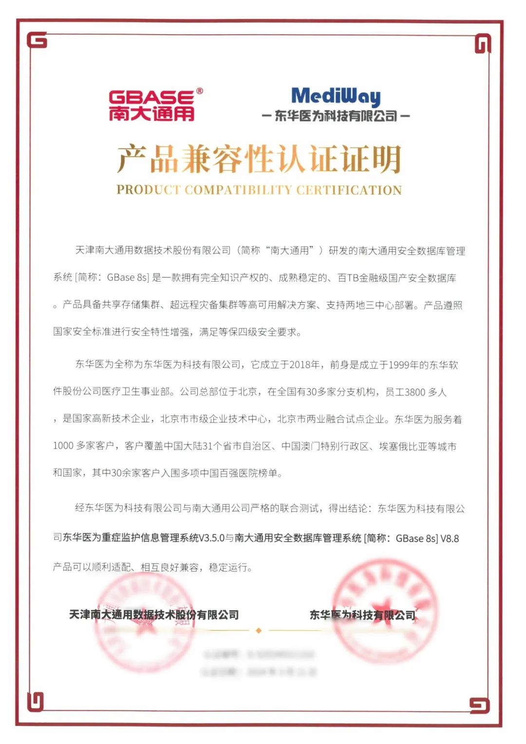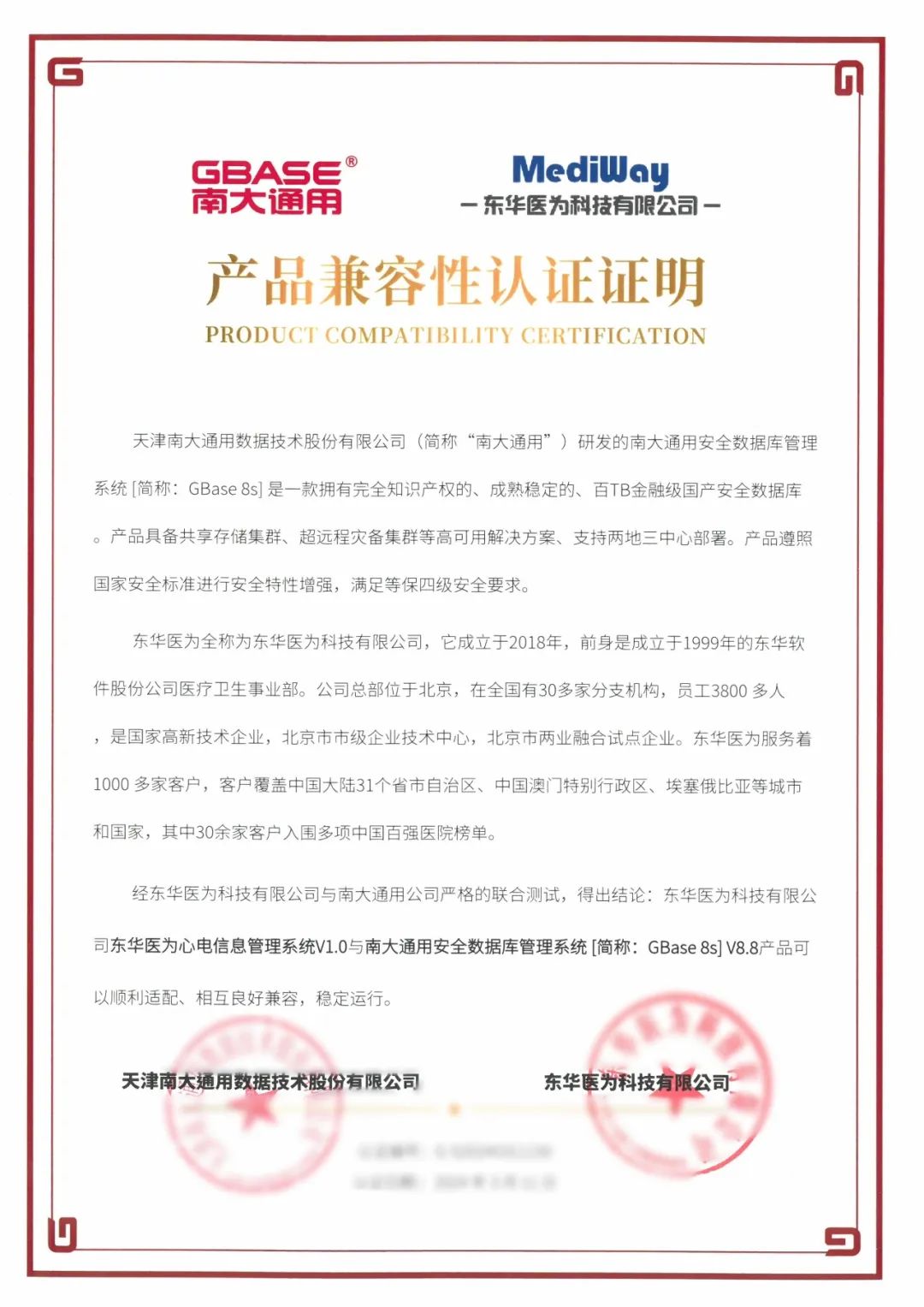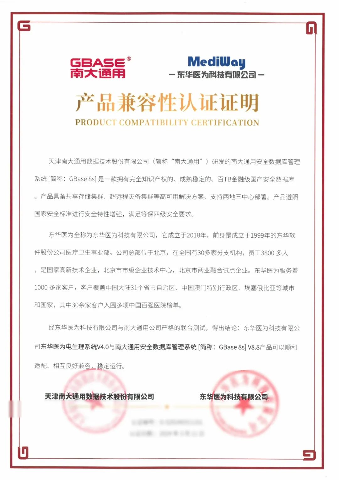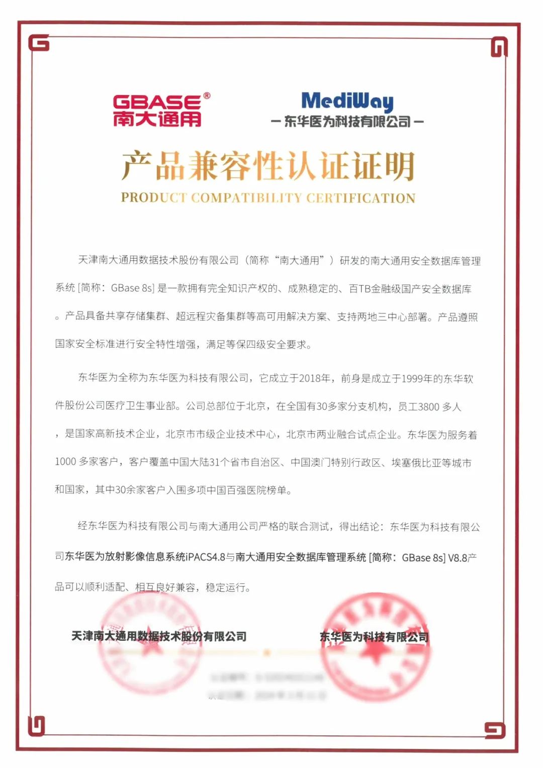 日前,GBASE南大通用与东华医为科技有限公司(以下简称东华医为)完成产品兼容联合认证。南大通用集中式事务型数据库GBase 8s V8.8、分布式事务型数据库GBase 8c V6与全民健康平台、检查检验结果互认平台、医共体平台、超声影像信息系统iUS4.8、放射影像信息系统iPACS4.8、内镜影像信息系统iES4.8等二十余款软件产品完成兼容性、功能、性能等方面的深度适配与调优。