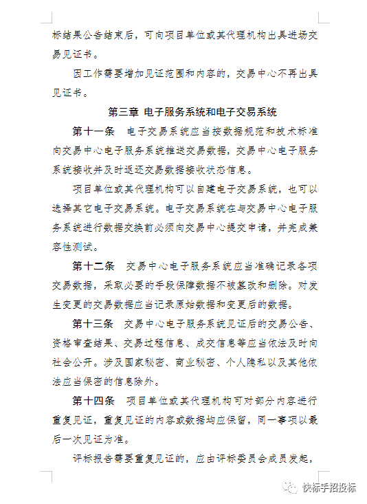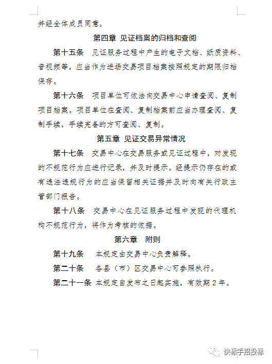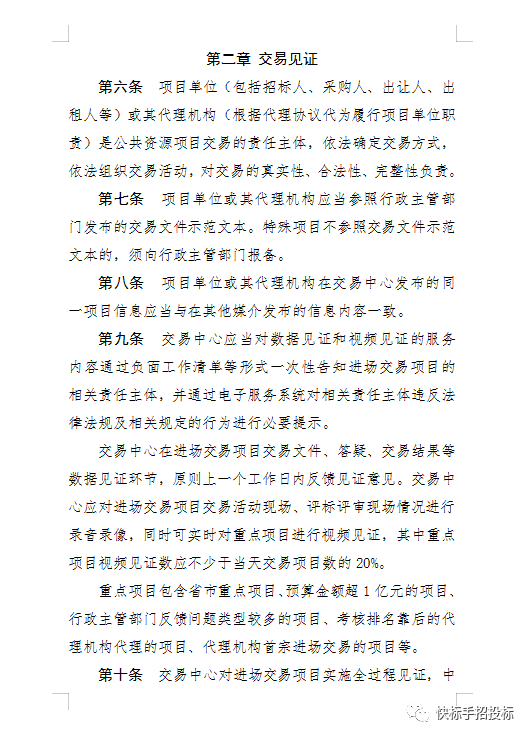 《规定》适用于在 交易中心登记进场的交易项目见证服务,从项目登记开始直至中标结果确认,涵盖项目 登记、招标、投标、专家抽取、开标、评标、定标等环节。