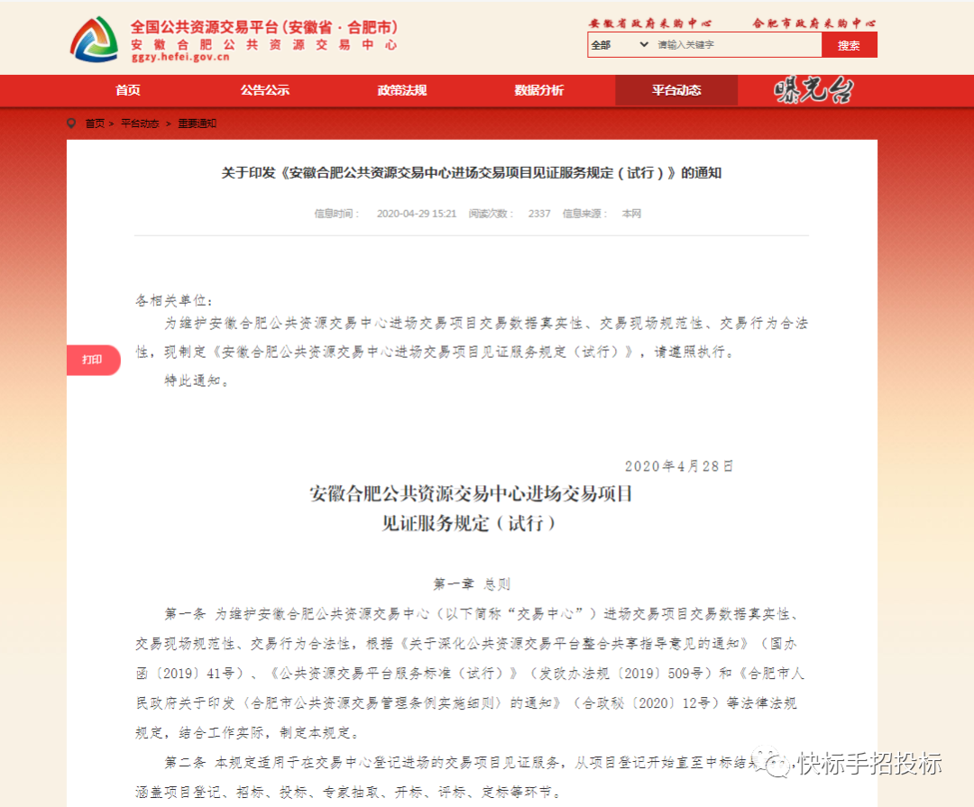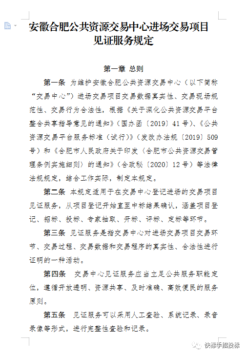 早在2020年4月份,安徽合肥公共资源交易中心就发布 《安徽合肥公共资源交易中心进场交易项目见证服务规定(试行)》,内容主要包括 交易见证、电子服务系统和电子交易系统、见证档案的归档和查阅、见证交易异常情况等。