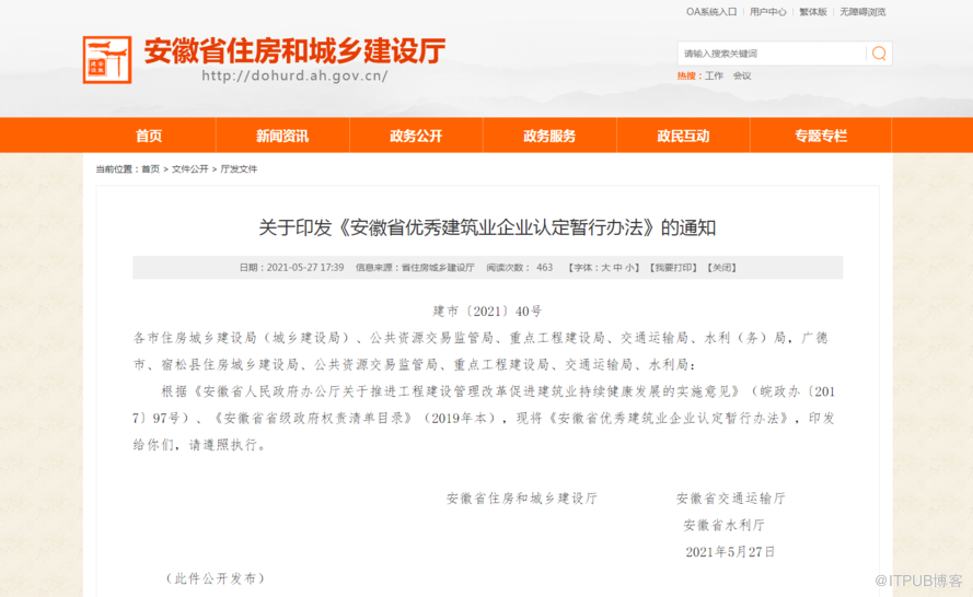 (四) 公布。经审定的“安徽省优秀建筑业企业”名单在 省住房城乡建设厅网站上公布,由省住房城乡建设厅颁发相关证明材料。