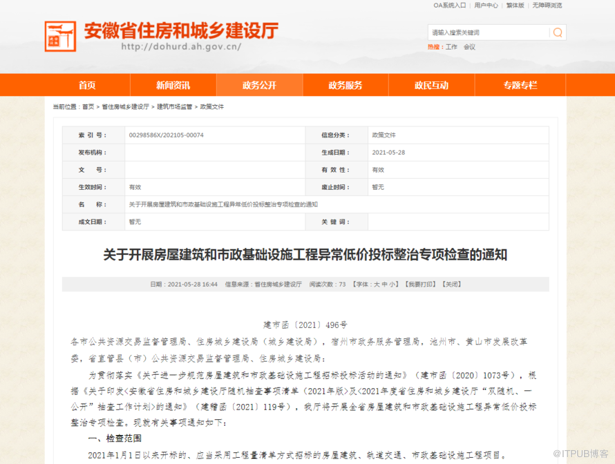 《关于开展房屋建筑和市政基础设施工程异常低价投标整治专项检查通知》