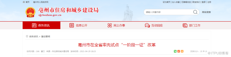 今年4月份,亳州市住房和城乡建设局就发布相关资讯,大胆革新,在全省率先试点“一阶段一证",从 施工许可阶段开始。“一阶段一证”实行“一家牵头、一口受理、并联审批、限时办结”的工作机制,施工许可阶段由市住房和城乡建设局牵头,牵头部门按照“首问负责、一次告知”的要求,接受项目单位或代建单位的咨询;项目单位或代建单位申请的一般事项,牵头部门可通过电话联系或信函的方式,协调各责任审批单位对申请事项予以指导。需要现场协调的,牵头部门按照“第一时间响应、第一时间处理、第一时间反馈”的要求,解决项目单位或代建单位提出的问题。此举通过一个部门牵头办理、代为跑腿,大大减少了工程项目的办理手续,方便了群众办事。