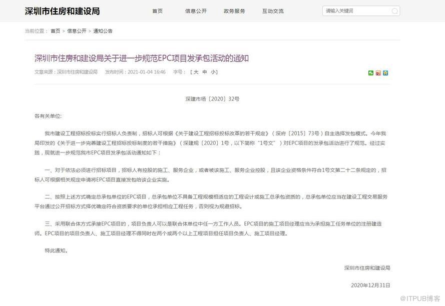 2020年12月23日,深圳市住房和建设局发布《 深圳市住房和建设局关于进一步规范EPC项目发承包活动的通知》, 对于依法必须进行招标项目 ,招标人可根据相关规定申请将 EPC项目直接发包给该企业实施; 采用联合体方式承接EPC项目的,项目负责人可以是联合体单位中任一方工作人员。