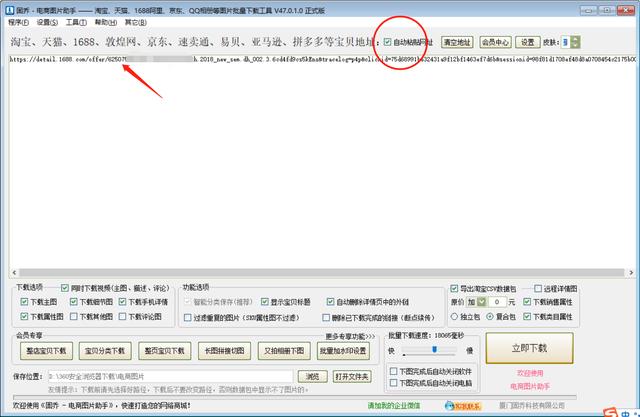 2、 运行固乔电商图片助手,“自动粘贴网址”打勾,网址会自动粘贴