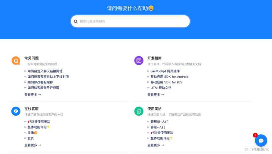 事实上,客户需要的帮助类型多种多样,也不乏一些简单、重复的问题,帮助文档是为了给客户提供快速有效的帮助的,美洽帮助文档分为多个板块,包括常见问题、开发指南、在线客服、使用美洽、更新日志五大类,分类明确,内容直观清晰,客户可以根据业务需求自行选定,精准定位。