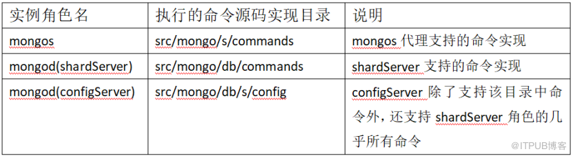 从上面的不同实例支持命令的源码目录文件可以看出,mongodb 内核源码设计之优秀,从目录结构即可一眼确定不同实例角色支持的各自不同命令信息,代码可读性非常好。目录结构可以总结为下表: