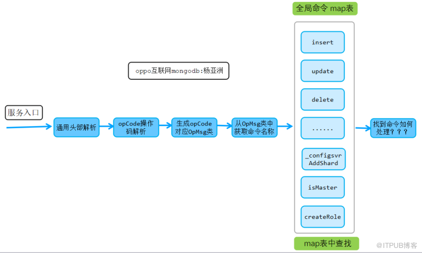从OpMsg 类中解析出命令名字符串后 ( 例如: ” insert ” 、 ” delete ” 等) ,从全局 map 表 _commands 查找,找到则执行对应命令。如果找不到,说明不支持该命令操作,进行异常提示处理。