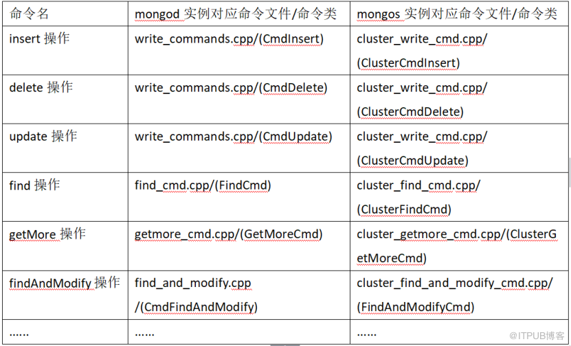 mongod 实例的写操作命令 ( 增、删、改 ) 由 write_commands.cpp 文件实现,该文件中的 CmdInsert 、 CmdDelete 、 CmdUpdate 类分别对应具体的增、删、改命令操作。读操作命令由 find_cmd.cpp 文件实现,对应命令类为 FindCmd