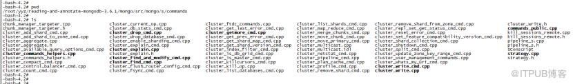 除了mongod 实例, mongos 作为代理转发节点,同样支持增、删、改操作。 mongodb 内核实现的时候,如果集群部署是 sharding 集群模式,则需要 mongos 代理,客户端访问入口为代理。正是因为代理模式为 sharding 分片集群模式,所以 mongos 支持的命令在源文件命名和命令类命名的时候,做了特殊标记。相比 mongod 实例,所有 mongos 支持的命令相关原文件和类实现基本上都增加 ” cluster ” 特殊标记。