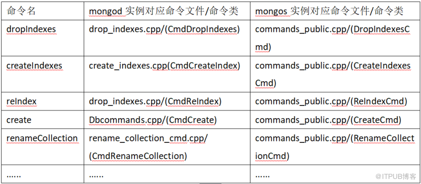 此外,也有部分mongos 和 mongod 实例命令不满足上面的命名规范,例如 "dropIndexes" 、 "createIndexes" 、 "reIndex" 、 "create" 、 "renameCollection" 等命令,各自命名规则如下 :