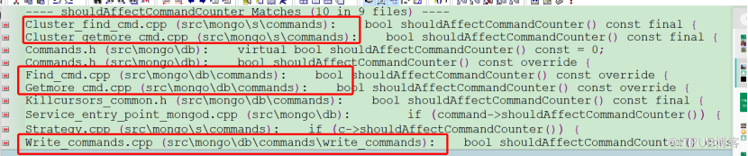 1) mongos 代理中的 clase Cluster_find_cmd { } 类和 class Cluster_getmore_cmd {} 类的 shouldAffectCommandCounter () 接口置为 false ,这两个类分别对应代理的“ find ”和“ getMore ”命令操作,也就说明 mongos 代理 de 这两个命令操作不会统计到 commands 中。