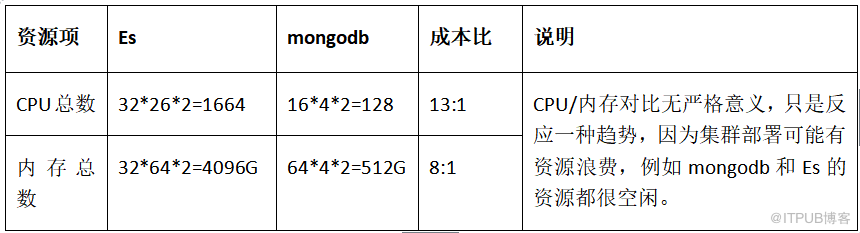 说明: 由于集群部署方式可能有很多冗余,上面的CPU 和内存成本比对比实际上不客观,可能 Es 部署时候规格设置浪费。当然, mongodb 实际上 CPU 资源也非常空闲,所以 CPU 和内存指标对比无太大参考作用。