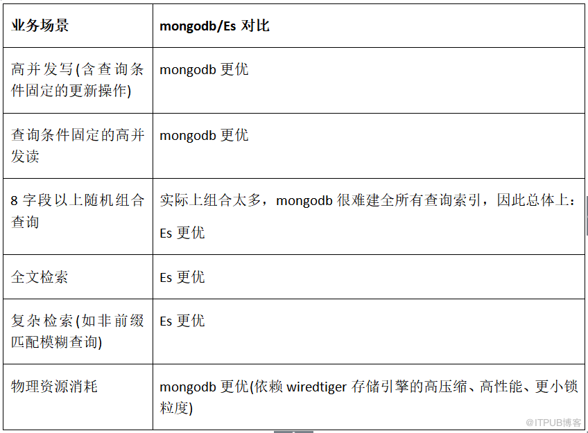 本文对应业务场景查询比较简单,查询更新等条件都是固定字段,不涉及复杂检索,所以在此场景mongodb 更具优势。另外, mongodb 当前默认的 wiredtiger 存储引擎,在高压缩、高性能、锁粒度等方面进一步提升了 mongodb 在该场景下的优势。