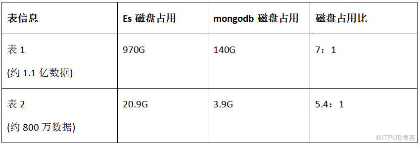 通过上面的选择算法,基本上做到了同样数据在Es 和 mongodb 中的对比,磁盘真实消耗对比结果如下 ( 说明:以下数据的 Es 磁盘占用为单个 Es 集群单副本方式计算结果,由我司 Es 运维开发人员提供; mongodb 磁盘占用计算方法为 2 个分片主节点真实磁盘占用之和,包括数据磁盘消耗 + 索引磁盘消耗 ) :