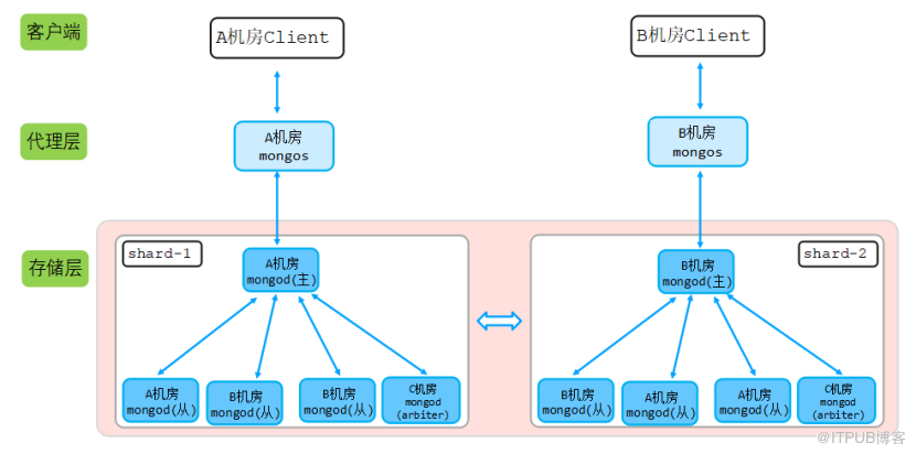 ② 如果机房A 挂掉,则机房 B 和机房 C 剩余 2mongod+1arbiter ,则会在 B 机房 mongod 中从新选举一个主节点。 arbiter 选举节点不消耗资源