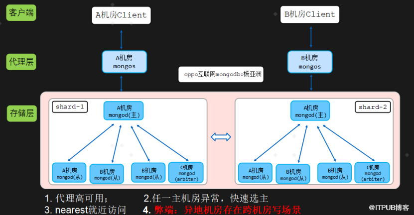 ① 每个机房代理部署2 个 mongos 代理,保证业务访问代理高可用,任一代理挂掉,对应机房业务不受影响。