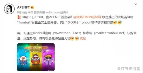 10月11日,APENFT基金会发布推文表示,由APENFT和波场Tron联合推出的波场吉祥物“波牛Tronbull”盲盒正式上线开售,共计10,000个波牛Tronbull等待铸造和交易。随着“波牛Tronbull”正式上线,APENFT基金会也同时推出了Twitter“Tronbull集3牛”活动、微博“牛人选牛”活动。“集3牛活动”将随机抽取50名用户获得超值奖励;“牛人选牛”活动将集赞向前6名的用户派送惊喜大奖。