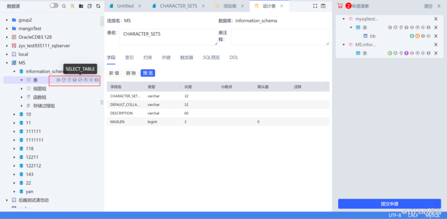 操作提权(SDT 细粒度提权),即在数据操作 SDT 树具体数据库对象上添加提权入口。当鼠标悬停到具体对象时,展示当前对象的 DML、DQL、DDL 权限标记,图标高亮表示已有的权限,点击置灰图标即可直接加入右侧提权申请清单并发起操作提权。