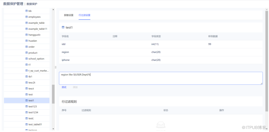 数据保护管理新增行过滤功能。行过滤是根据不同用户的参数不同,进行规则设置,从而实现展示的结果集数据不同,让不同人员对同一张表的数据查看的结果集不同。