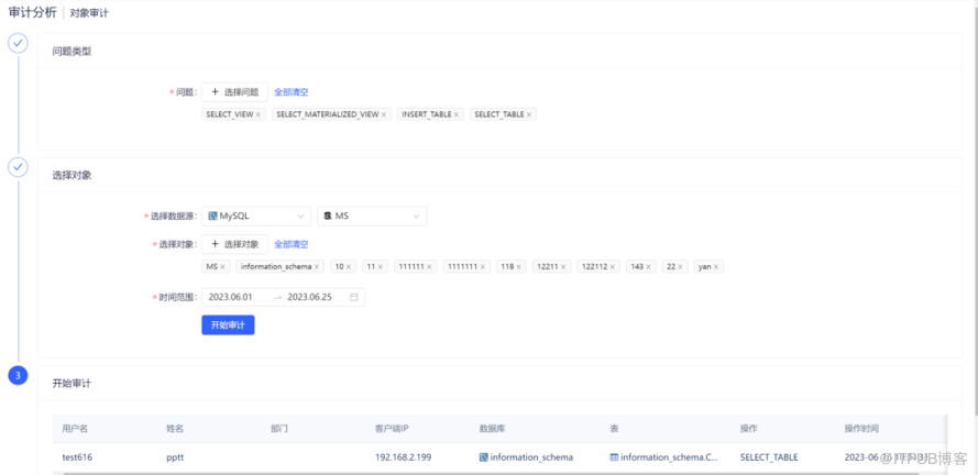 对象审计: 以数据库对象为角度的独立审计功能,用户可指定问题类型和数据库对象进行审计,能够快速定位数据库对象在何时被何人进行了何种操作,更直观的展示了系统中的审计信息