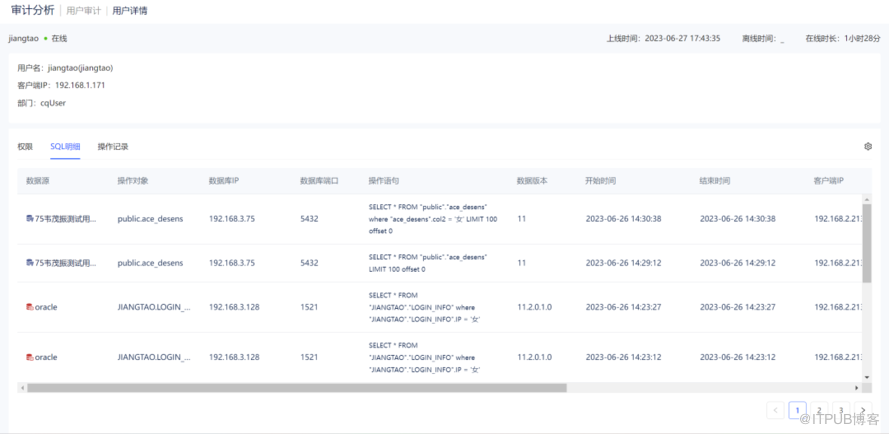 用户审计: 以用户对象为角度的独立审计功能,用户可查看指定用户在此系统中的操作行为,包括对数据库的操作、权限以及SQL语句,快速定位个人的操作行为