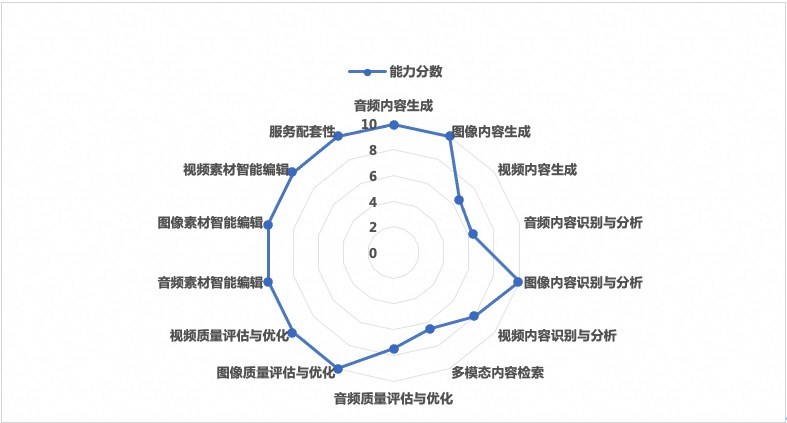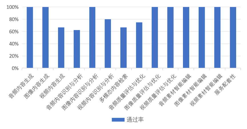 ,并在多项测评模块通过率达满分,其中,音频内容生成、图像内容生成、图像内容识别与分析、视频素材智能编辑、图像素材智能编辑、音频素材智能编辑、视频质量评估与优化、服务质量评估与优化、服务配套性