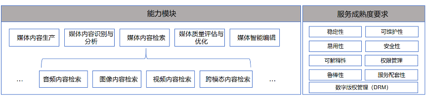 媒体生产、识别分析、检索、质量优化、智能编辑等关键能力,每项关键能力涵盖音频、图片、视频、多模态等媒体内容。