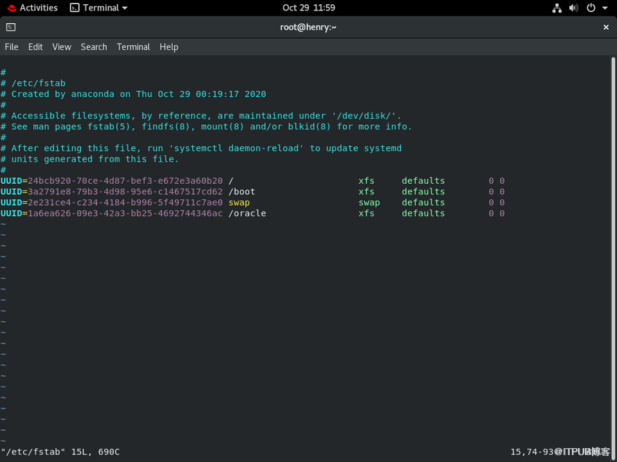 UUID=1a6ea626-09e3-42a3-bb25-4692744346ac /oracle xfs defaults 0 0