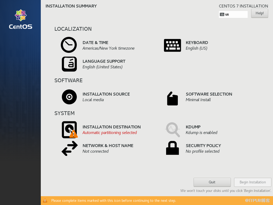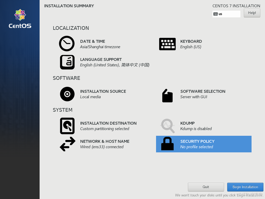 - 在 选项汇总界面 选择 Begin Installation 进行操作系统安装